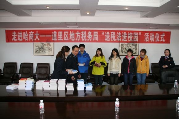 最后,邹本华副局长代表道里区地税局向我校学生赠送了《企业所得税法法规汇编》、《营业税条约及细则释义与实用法规汇编》、《财产与行为税法法规汇编》和《税法知识宣传手册》等。