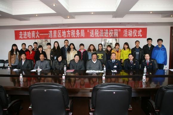 4月19日上午,在行政楼三楼会议室举行了走进哈商大——道里区地方税务局“送税法进校园”活动启动仪式。道里区地税局副局长邹本华一行与我校部分师生参加了活动启动仪式。启动仪式由宣传部长李德学教授主持。