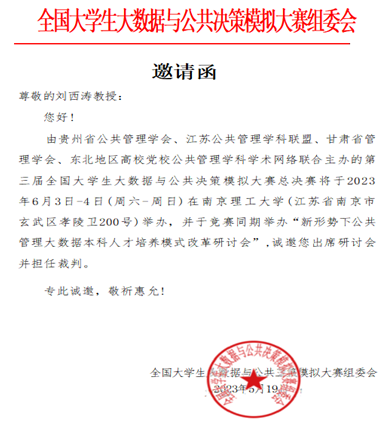 202363日至4日,第三届全国大学生大数据与公共决策模拟大赛总决赛在南京理工大学举行,本次大赛由江苏公共管理学科联盟、贵州省管理学学会、甘肃省管理学会、东北地区高校党校公共管理学科学术网络联合主办,南京理工大学承办,南京奥派信息产业股份公司提供技术支持。比赛分为初赛和决赛两个阶段,全国共计306支高校队伍参加。初赛环节以公共治理大数据分析平台为依托,通过系统评分最终有50支队伍进入总决赛。大赛组委会邀请我院副院长刘西涛教授担任总决赛评委。