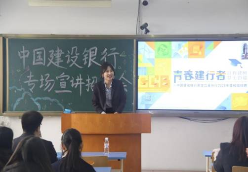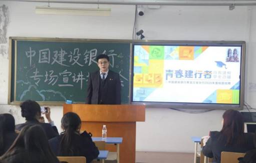 会上,宣讲员从中国建设银行的企业文化、岗位发展前景、员工福利以及岗位培训几个方面详细介绍,吸引同学们的关注。