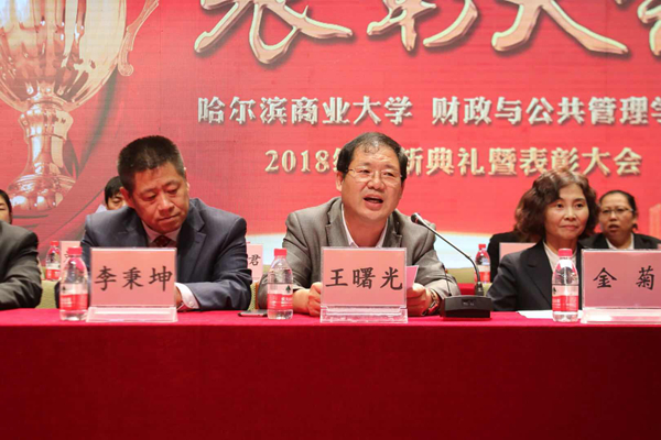 17点40分表彰大会正式开始,大会由学院副院长孔微巍教授主持。一是奏国歌,学院全体师生同时起立,庄严肃穆,奏唱国歌;二是举行颁奖仪式,正处级组织员蔡德发教授宣读本科生及研究生获国家奖学金、黑龙江省三好学生、哈尔滨商业大学优秀女大学生、哈尔滨商业大学三好学生名单,副院长李红星教授宣读优秀学生干部名单、获哈尔滨商业大学轩辕奖学金、哈尔滨商业大学奖学金的学生名单,副院长景宏军副教授宣读2018级新生优秀学员名单、优秀导生、新生优秀寝室名单。随后,获奖代表上台领奖。