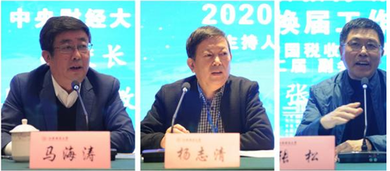中国税收教育研究会2020换届工作会议由第二届副会长张松教授主持。副会长兼秘书长杨志清教授作《换届工作报告》。新任第三届中国税收教育研究会会长马海涛教授发表就职感言。 年会主题演讲环节由常务副会长兼秘书长樊勇主持。