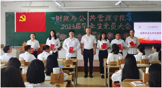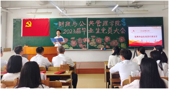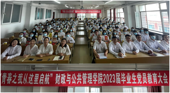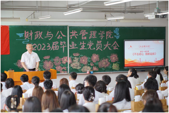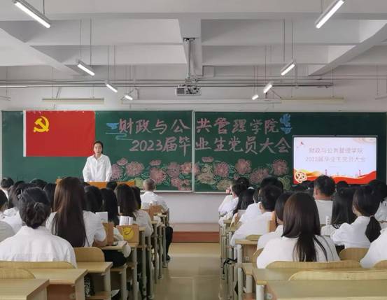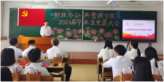 为深入推进学习贯彻习近平新时代中国特色社会主义思想主题教育,加强毕业生党员教育管理,发挥党员先锋模范作用,2023年6月12日上午,财政与公共管理学院召开2023届毕业生党员大会。学院党委书记赵宇新、学院党委副书记李陈亚、学院团委书记范璐璐、学院团委副书记魏丹、学院团委副书记王宝华、辅导员初伟铭、辅导员张含笑、辅导员卢冠宇、2023届全体毕业生党员出席会议。财政与公共管理学院19级财政学专业学生党支部书记李晨菲主持会议。