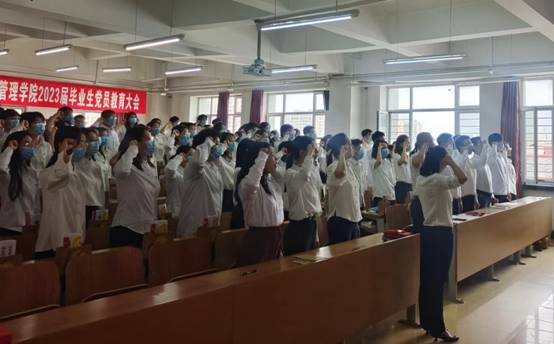 大会在庄严的《国际歌》中拉开序幕。为带领毕业生党员重拾初心与使命,学院党委副书记李陈亚带领全体党员,面向党旗,举起右拳,庄严重温入党誓词。在铿锵有力的誓言中,坚定入党信念、牢记使命职责的信念感和使命感油然而生。
